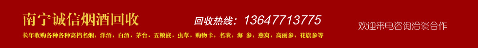 南宁诚信烟酒回收是一家专业烟酒礼品回收公司,南宁名烟回收多年从事高价回收《冬虫夏草回收》、《洋酒回收》、《名烟名酒回收》《茅台酒回收》等各种烟酒礼品!经验丰富!我们的优势:各地区均设有服务网点,各地区当天均可专车上门,现金交易、各大银行转汇均可!价格合理、一站式服务、安全快捷、为客户保密个人信息!信守承诺!服务周到!地址:广西省南宁市(回收烟酒卡冬虫夏草)冬虫夏草类回收:回收各种礼盒装虫草、断虫草、竹签虫草、发霉虫蛀虫草、海参燕窝等;白酒类回收:茅台、老茅台、五粮液、老五粮液、虎骨酒、剑南春、国窖等各类名酒老酒系列;名烟类回收;中华香烟,黄鹤楼1916,和天下,黄金叶,利群等各种名烟‘’洋酒类回收:轩尼诗、人头马、蓝带、路易十三等各类洋酒红酒系列红酒回收:拉菲、拉图、玛歌、澳比昂、木桐、梅多克等系列各地区均提供免费上门服务,不论你是个人还是单位,不论你在什么地方,你只要拨打我们的热线,我们将24小时提供上门服务!